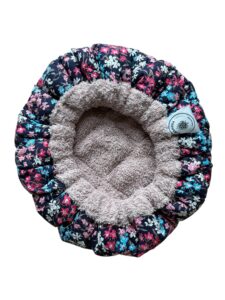 Deze prachtige heat cap is handgemaakt van 100% katoen, 500 gram biologisch lijnzaad en een elastiek. De buitenstof heeft een prachtige print van witte, blauwe en roze bloemetjes op een zwarte achtergrond. De binnenstof is een roze katoenen badstof. De binnenstof is omgeslagen. De diameter is 30 cm.