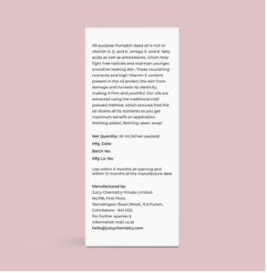 Deze 100% pure en biologische koudgeperste pompoenpit olie is rijk aan vetzuren, vitamines en antioxidanten.